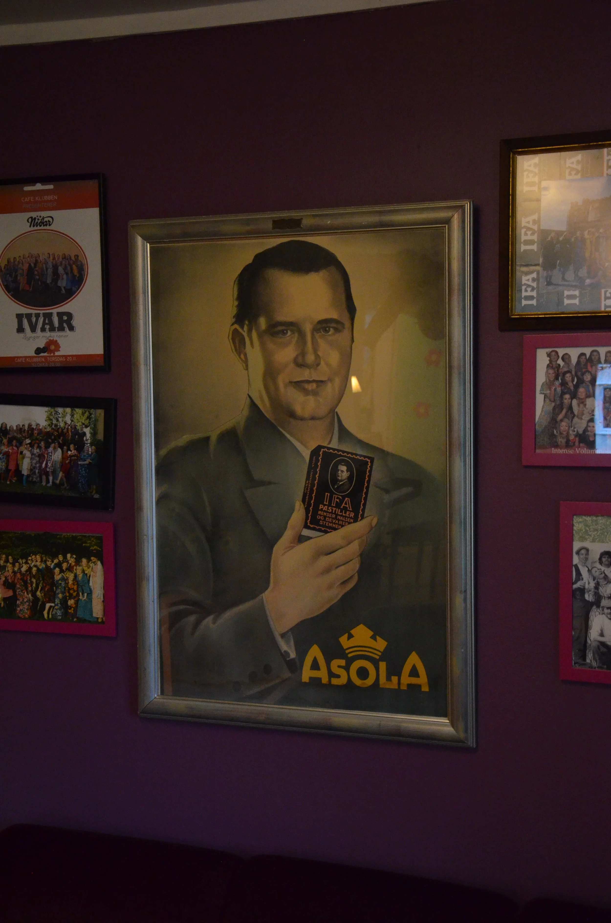 With various shades of pink imprinted on our retinas, we’re moving on to another women’s association – the girls’ choir Pikekoret IVAR. In their sweet, red, wooden house live four Ivarinner. The only man in sight here is Ivar Frithiof Andresen, the opera singer that the IFA-pastilles are named after. He’s quite literally everywhere, with pictures of him hung up in almost every room. The pastille is apparently good for the singing voice and is therefore highly valued by the choir girls – something clearly reflected in their wall décor.