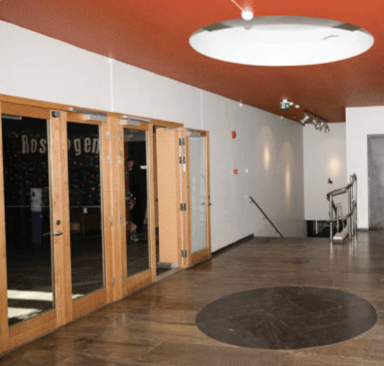 Videre innover i bygget finner vi den erke-funksjonalistiske sirkelen i kvadratet i taket ved inngangen til Festsalen. Vår mann, Funkis-Jensen, var opptatt av kontraster både i farger og fasonger, noe som kommer klart til uttrykk i taket så vel som på fasaden av selve bygningen. “Han sa: Reinkarnasjon, sirkler og kvadrater”, for å sitere Ari Bajgora, eller er det da Vincis vitruviske mann vi skal tenke på når vi står her under? Sirkelen det himmelske og firkanten det jordiske – med Samfunnet et sted midt imellom?